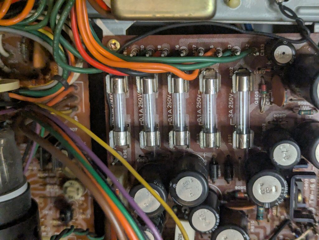 しかし、電源基板(P800 Power Supply Unit)を確認すると、複数のガラス管ヒューズのうち、0.1A/250Vの3本が切れているのを発見しました。