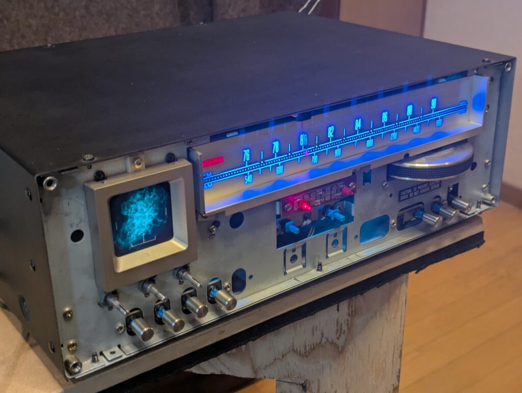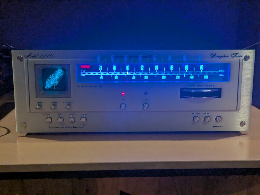 通常のチューナーとしての機能に加え、フロントパネル左側に鎮座する円形のブラウン管(CRT)。これは単なる飾りではなく、信号波形を表示する本物のオシロスコープです。音楽を聴くだけでなく、波形の揺らぎとして「視る」。このギミックに、当時のオーディオ少年たちはどれほど胸を焦がしたことでしょうか。