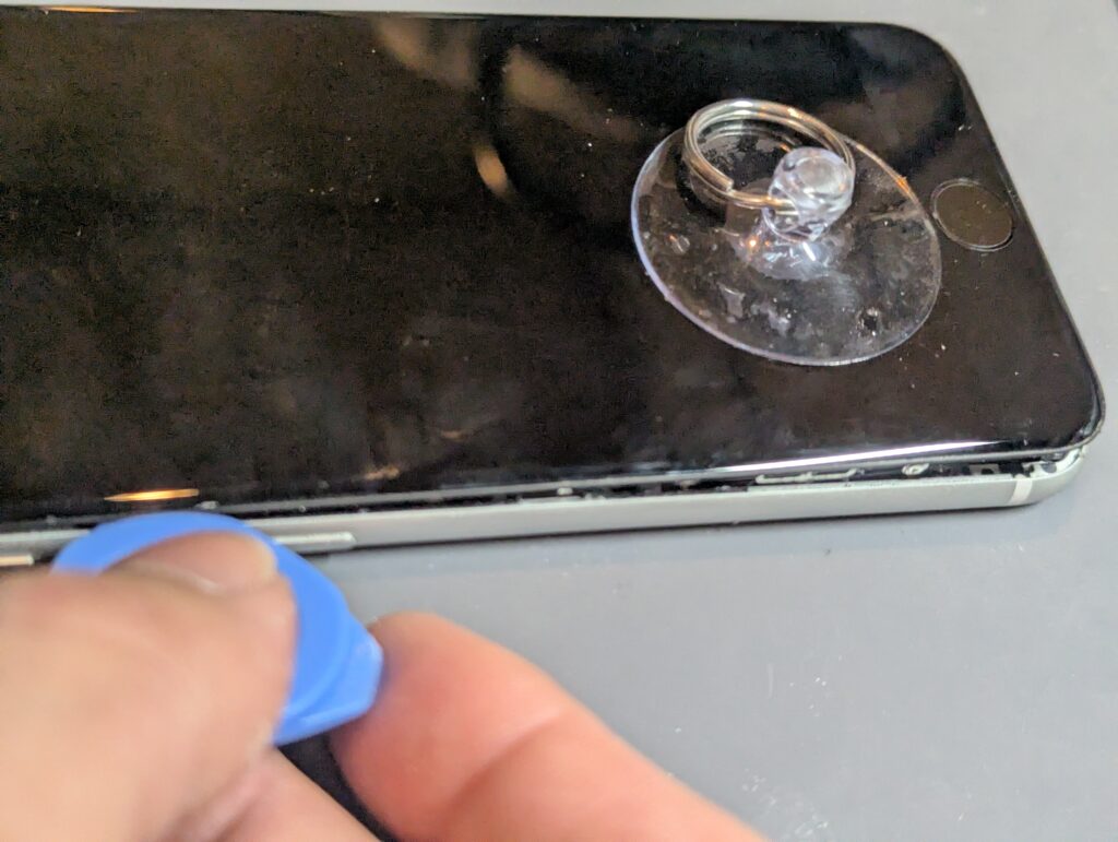 ヒートガン(ドライヤー)で画面の縁を十分に温め、吸盤で引っ張りながらピックを差し込みます。ここで焦ってこじ開けると、画面が割れます。
