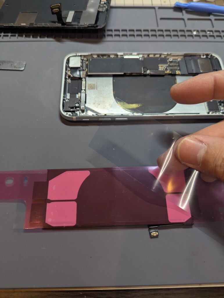 バッテリーを固定している「引っ張って剥がすテープ」。これが途中で切れた時の絶望感は、DIY修理あるあるです。