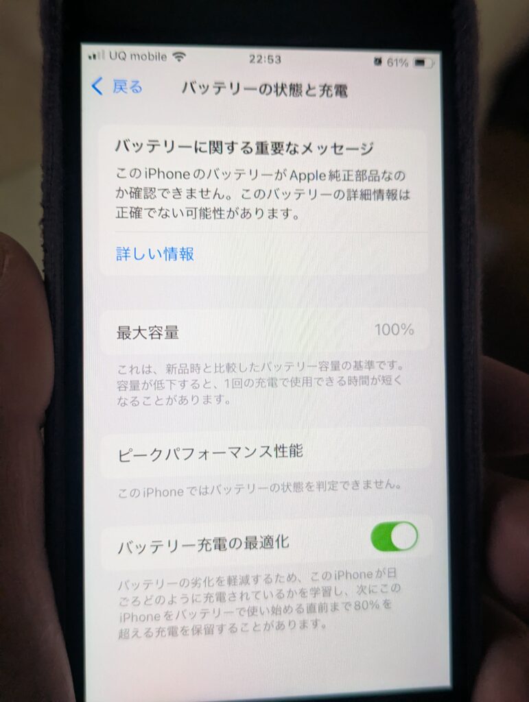 無事交換が完了しました。設定画面で「最大容量」が表示されなくなる(※SE2の仕様上、互換バッテリーでは警告が出ることがある)場合もありますが、これはOS側の仕様です。