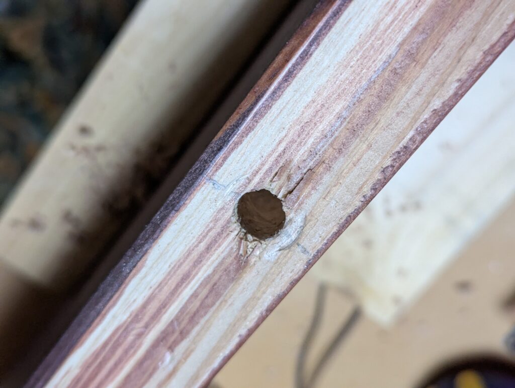 カフェ板の側面に10mmの穴を開けようとしたとき、「だいたいこの辺だろう」と目測で墨出しをして、ドリルを手持ちで斜めに打ち込んでしまう…。