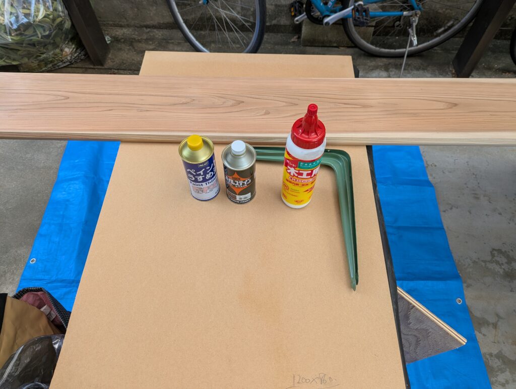 | オイルステイン塗料 | 油性タイプ(お好きな色を選択。私は玄関ドアの色に合わせてマホガニーを選択した。) ※水性タイプの方が扱いやすいので、そちらでも良いです。個人的な趣味で今回は油性を選択。 | 適量 | 木材の塗装 |