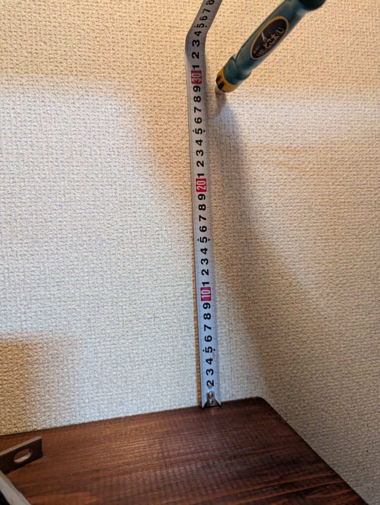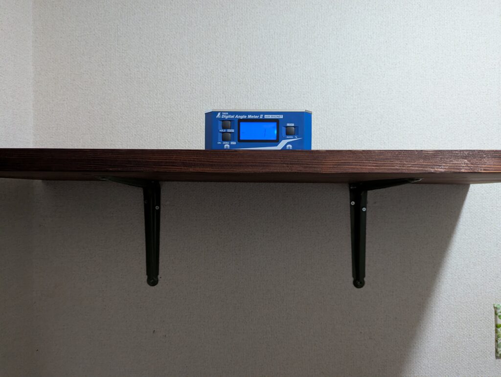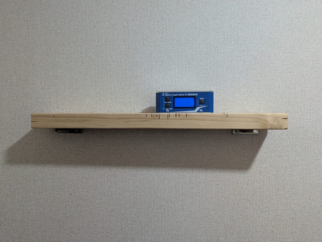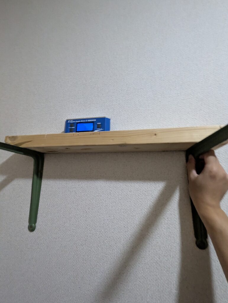 一つ目の金物を基準にして、板と水平センサーで二つ目の位置を決める。この手順で確実に水平を出せます。